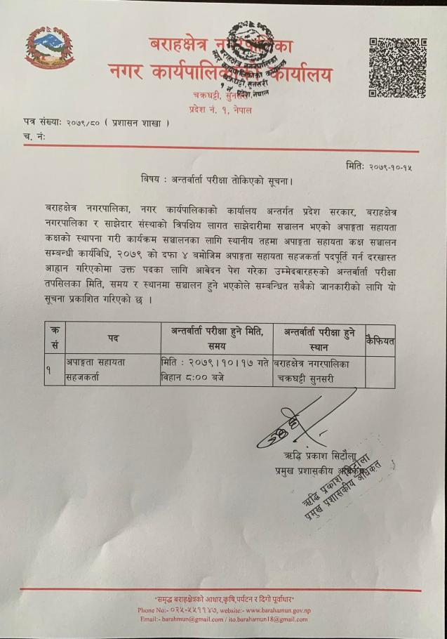 बराहक्षेत्र नगरपालिका,नगर कार्यपालिकाको कार्यालय , चक्रघट्टी, सुनसरी, कोशी प्रदेश ,नेपाल