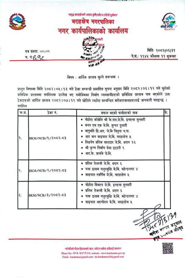 आर्थिक प्रस्ताव खुल्ने सम्बन्धी सूचना