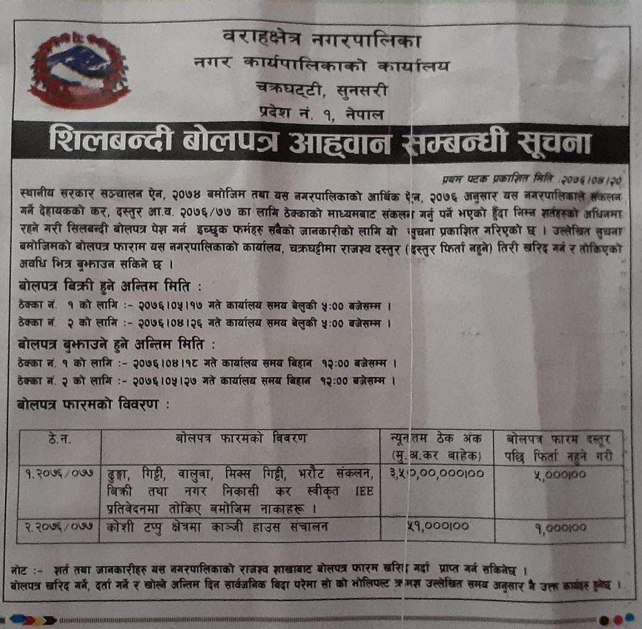 ढुङ्गा गिट्टी सम्बन्धि बोलपत्रको सूचना २०७६-०७७