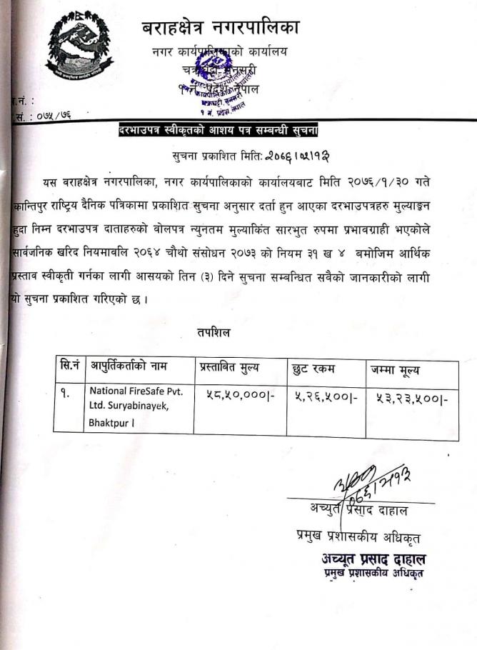 दमकल खरिदका लागि आर्थिक प्रस्ताव स्वीकृत सम्बन्धी सूचना
