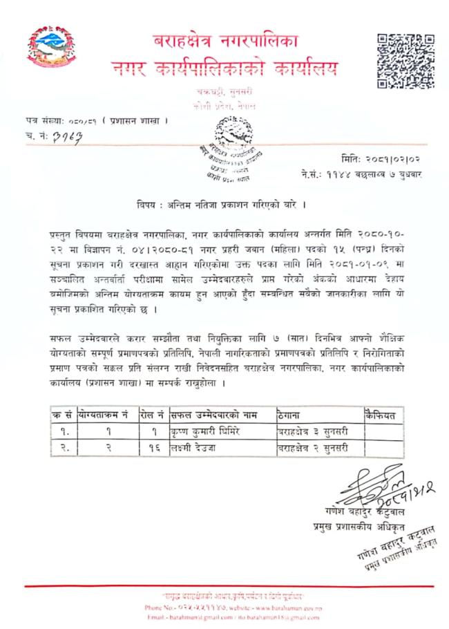 नगर प्रहरी(महिला) को अन्तिम नतिजा प्रकाशन सम्बन्धि सूचना