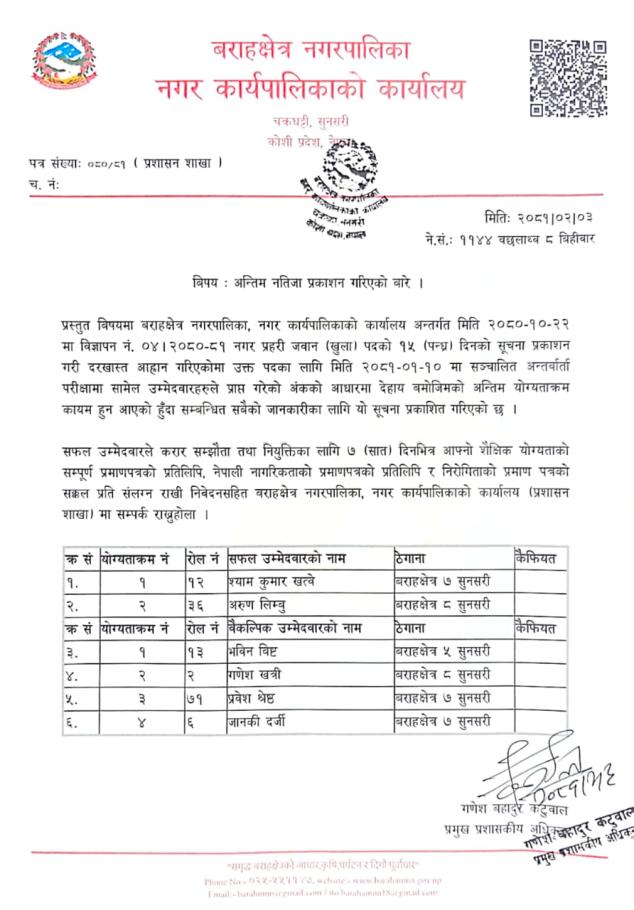 » नगर प्रहरी (खुल्ला) अन्तिम नतिजा प्रकाशन सम्बन्धी सूचना