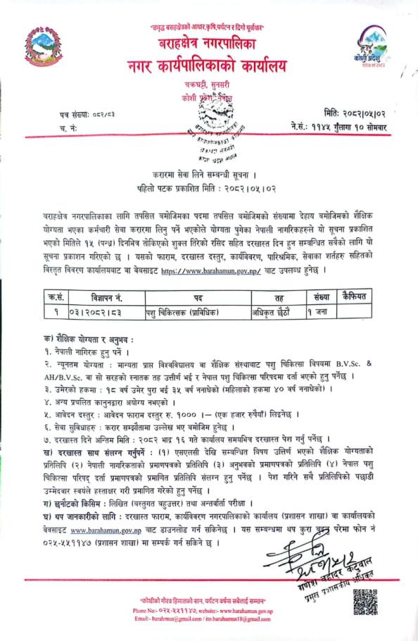 पशु चिकित्सक करारमा लिने सम्बन्धी सूचना, फारम र कार्यविवरण