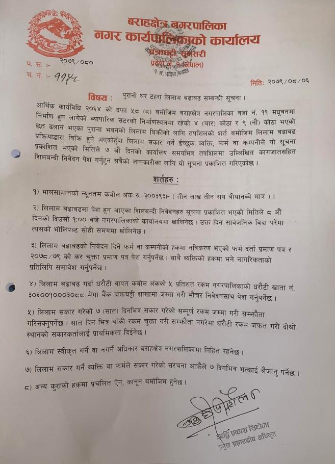 पुरानो घर टहरा लिलाम बढाबढ सम्बन्धी सूचना