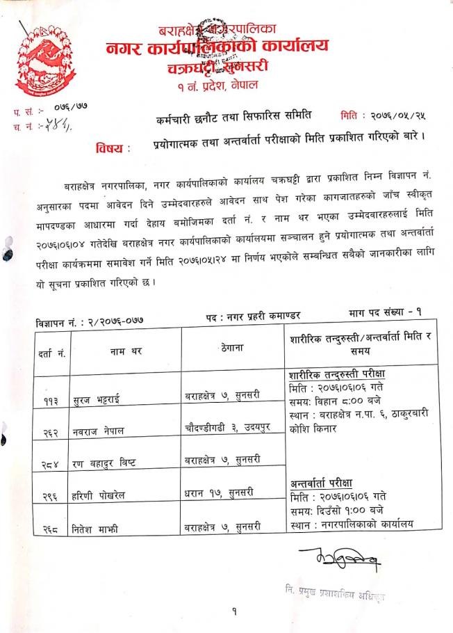 » प्रयोगात्मक तथा अन्तवार्ता परिक्षाको मिति प्रकाशन (नगर प्रहरी कमाण्डर)
