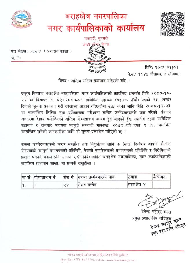 प्राविधिक सहायको अन्तिम नतिजा प्रकाशन सम्बन्धमा ।