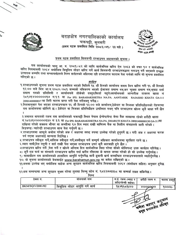 बिद्युतीय लोडर आपुर्ती गर्ने सम्बन्धी दरभाउपत्र आव्हानको सूचना
