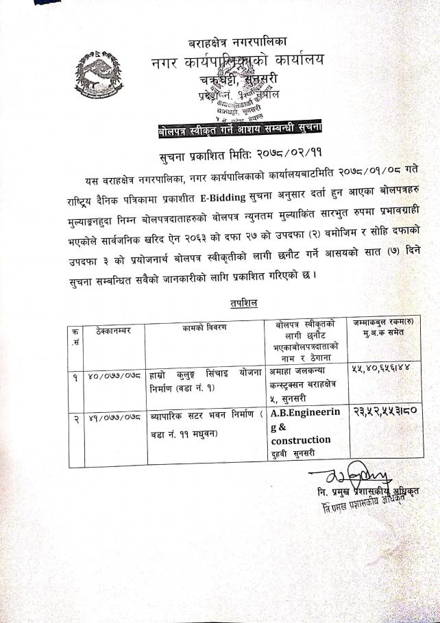 » बिभिन्न ठेक्का काे आषय सम्बन्धि सूचना (ठे.नं. ४० र ४१ )