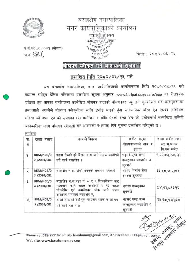 बिभिन्न ठेक्काको आशय सम्बन्धि सूचना