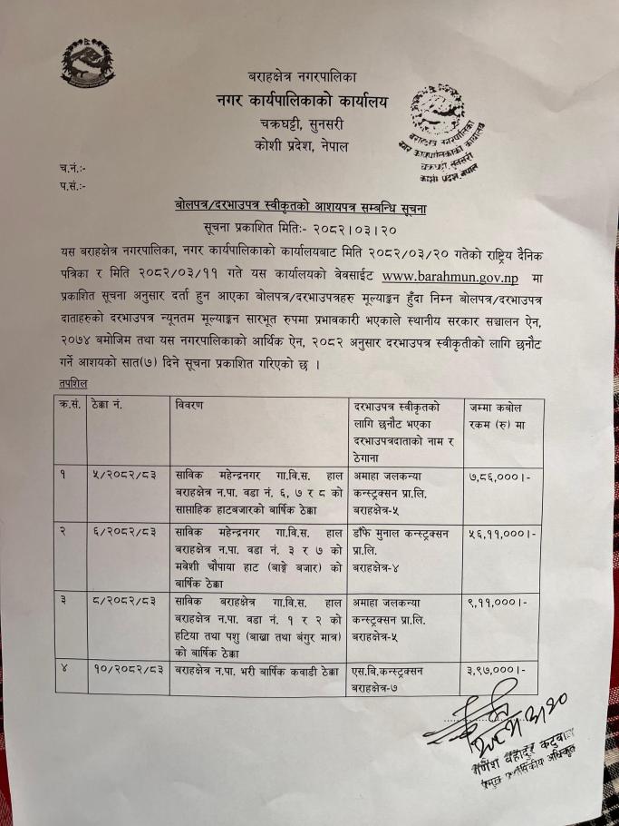 बोलपत्र/दरभाउपत्र स्वीकृतको आशयपत्र सम्बन्धी सूचना