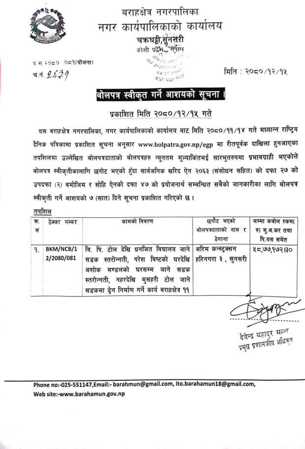 बोलपत्र स्वीकृत गर्ने आशयको सूचना