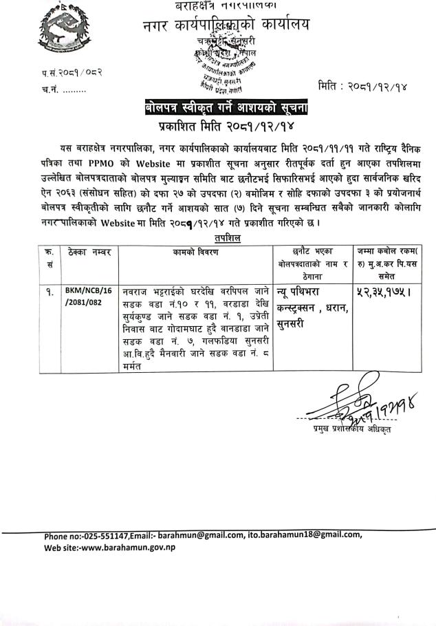» बोलपत्र स्वीकृत गर्ने आशय सम्बन्धी सूचना