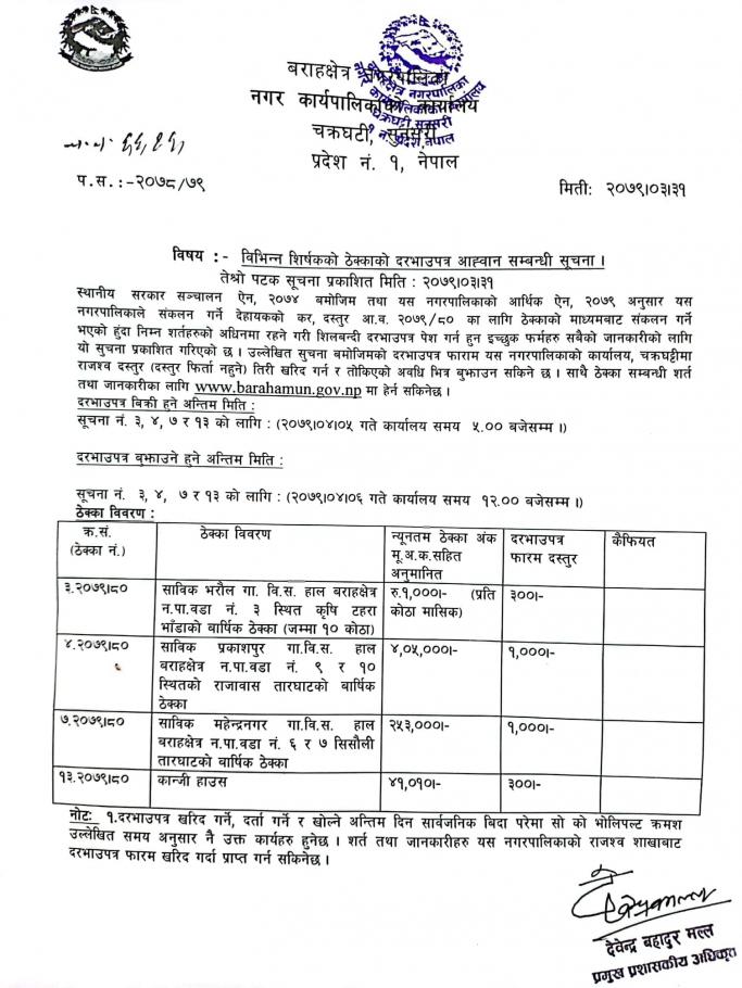 राजश्व सम्बन्धी बिभिन्न शिर्षकको ठेक्काको सूचना