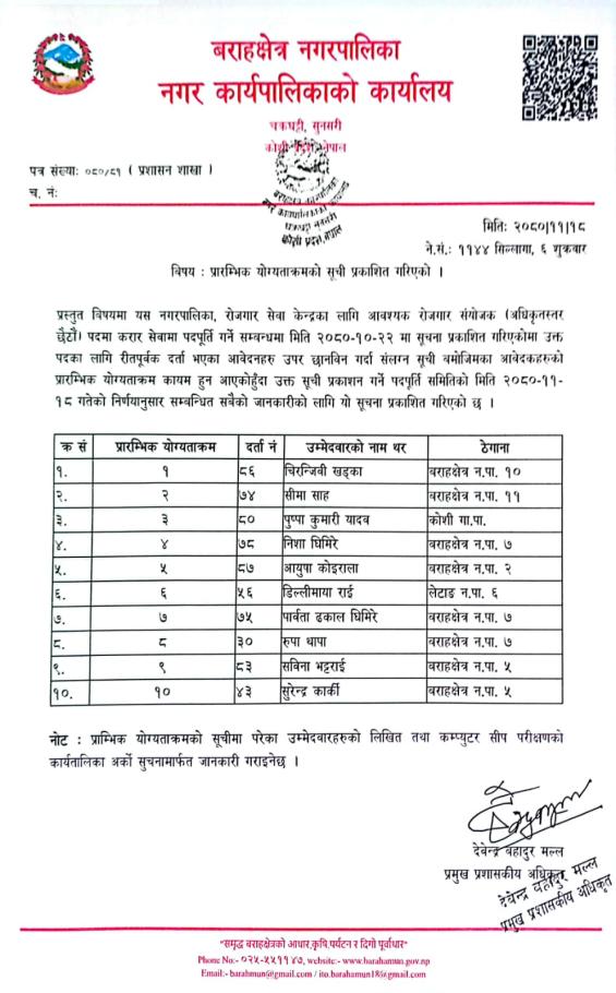 रोजगार संयोजकको प्रारम्भिक योग्यताक्रमको सूची