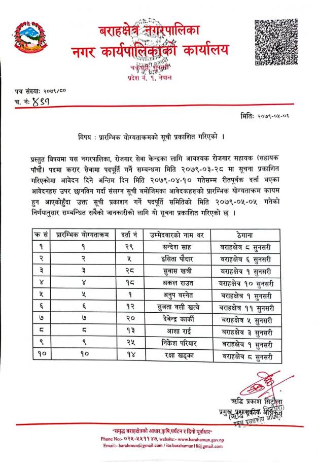 रोजगार सहायकको प्रारम्भिक योग्यताक्रमको सूची प्रकाशन गरिएको सम्बन्धमा