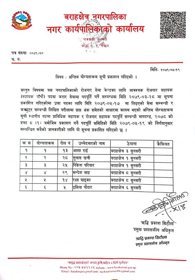 रोजगार सहायक (सहायक पाँचौ) को अन्तिम योग्यताक्रम सूचि प्रकाशन सम्बन्धमा ।