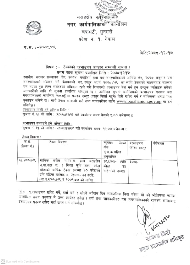 वडा नं ३ कृषि टहरा कोठा भाडाको दरभाउ पत्र आव्हान सम्बन्धी सूचना