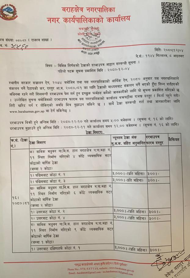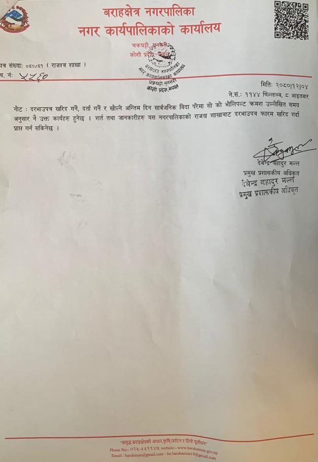 विभिन्‍न शिर्षकको ठेक्काको दरभाउपत्र आव्हान सम्बन्धी सूचना