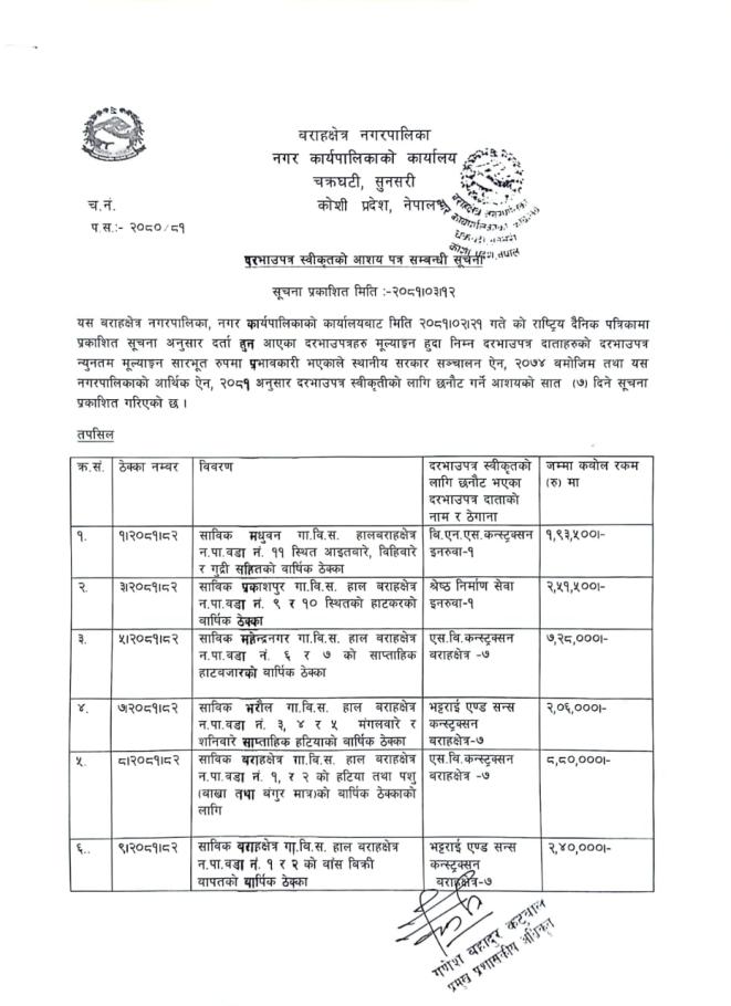 विभिन्न शिर्षकको दरभाउपत्र स्वीकृतीको आशयको सूचना