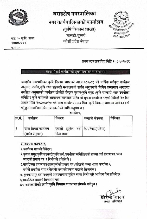 साना सिँचाइको प्रस्ताव आव्हान सम्बन्धि सूचना