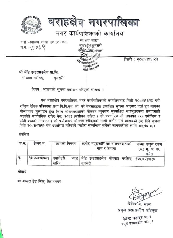 स्यानेटरी प्याड खरिद सम्बन्धि आषयको सूचना