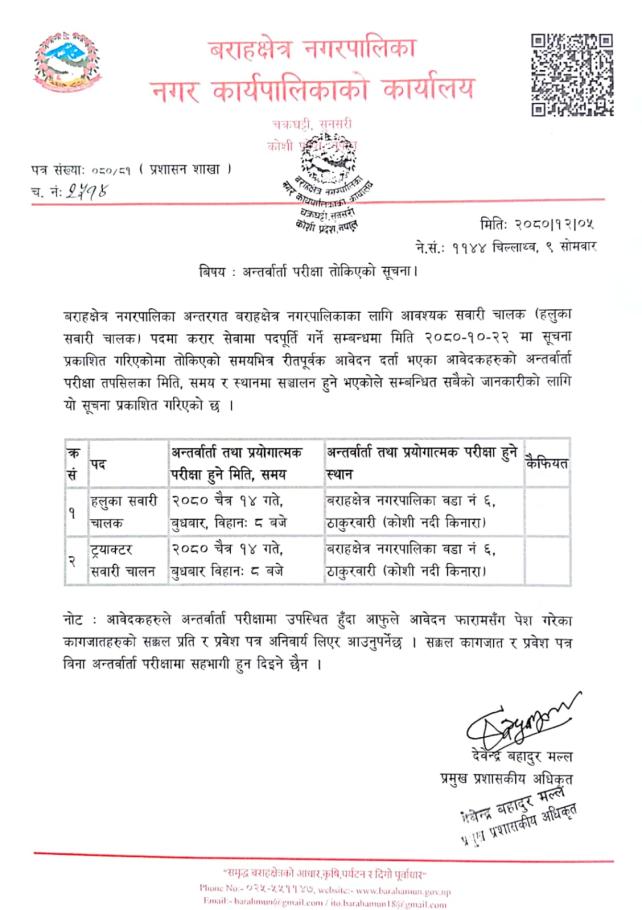 हलुका सवारी चालक तथा ट्रयाक्टर चालकको परिक्षा सम्बन्धी सूचना