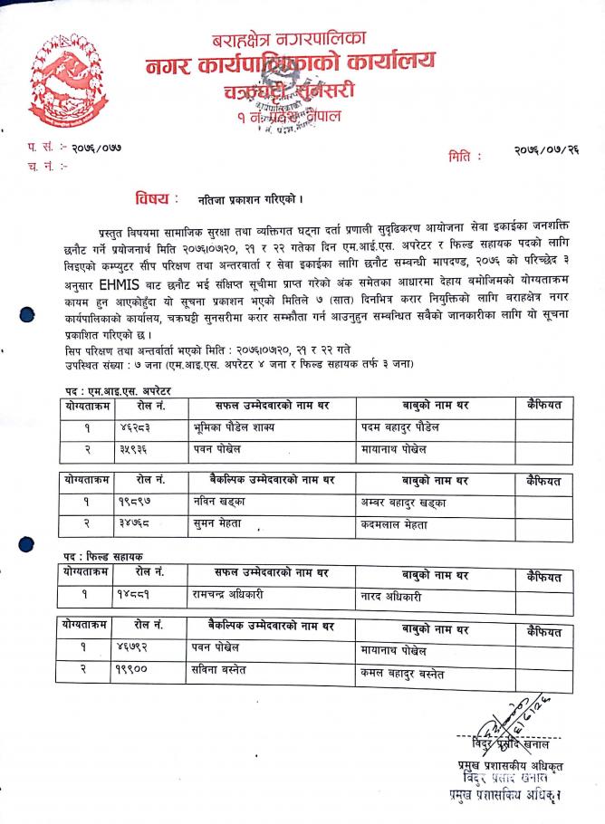 MIS अपरेटर तथा फिल्ड सहायक को नतिजाको सूचना